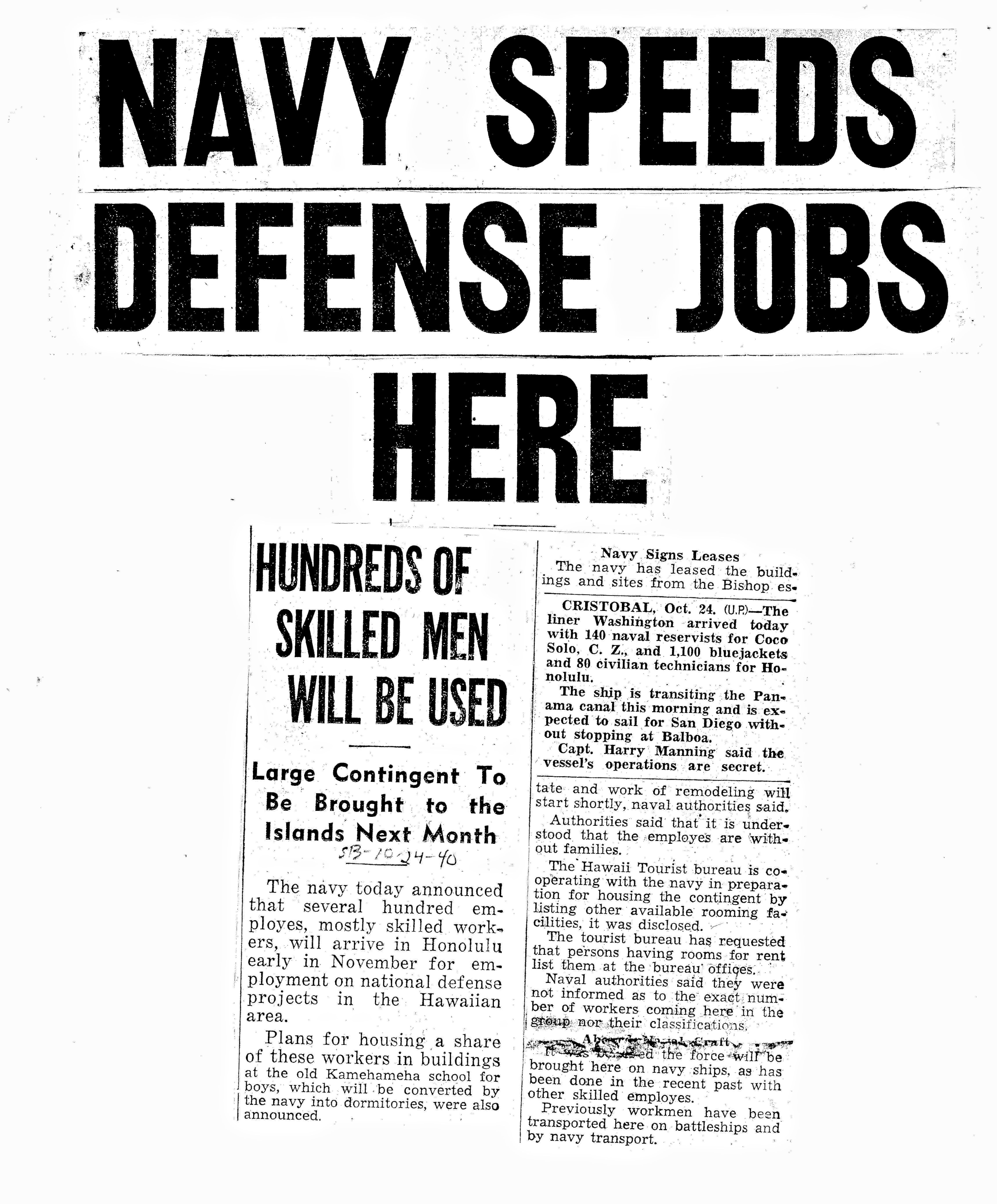 The near constant construction required a steady stream of workers. Military contractors were constantly recruiting skilled workers from the continent. These workers signed short term contracts with the opportunity to return home after their work was finished. Like the teachers, many contract workers signed on to work in Hawai‘i for the novelty or the chance for adventure, but for the vast majority, the pay was the most attractive feature. For some, Hawai‘i was a place of economic refuge from the vicissitudes of the industrial and agricultural economies, especially during the Depression.