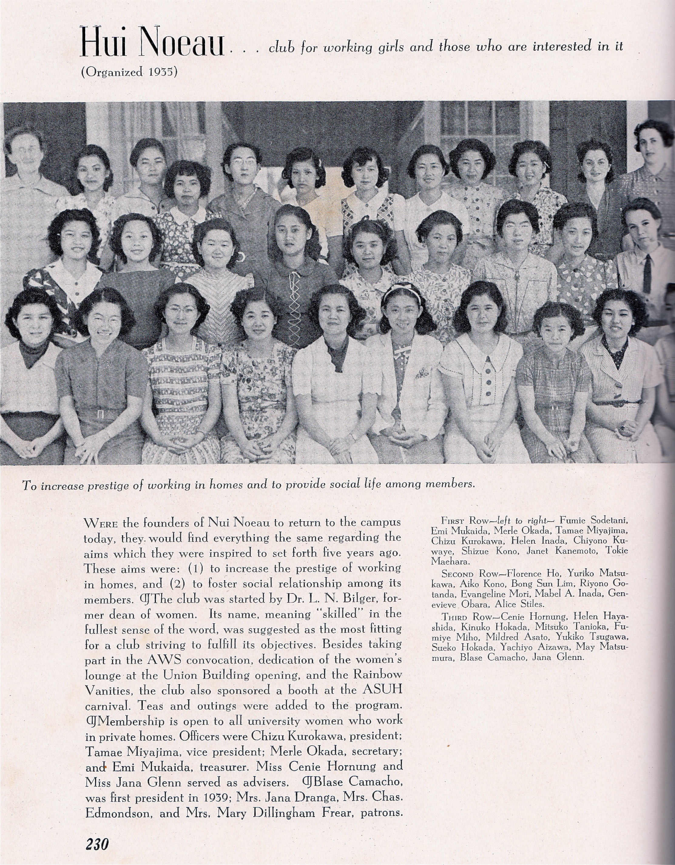 In 1935, to increase “the prestige of working in homes and to foster social relationships among its members” (Ka Palapala, 1939, p. 230), Dr. Leonora N. Bilger, faculty member in the Chemistry Department and Dean of Women, founded a club “for all University women who work in private homes.” Originally named the University Maids Club, the club was later renamed Hui Noeau at the members’ request. Its new name, “meaning ‘skilled’ in the fullest sense of the word, was suggested as the most fitting for a club striving to fulfill its objectives.” This new generation of workers in private homes saw themselves and wanted others to see them not as servile but as skilled workers.