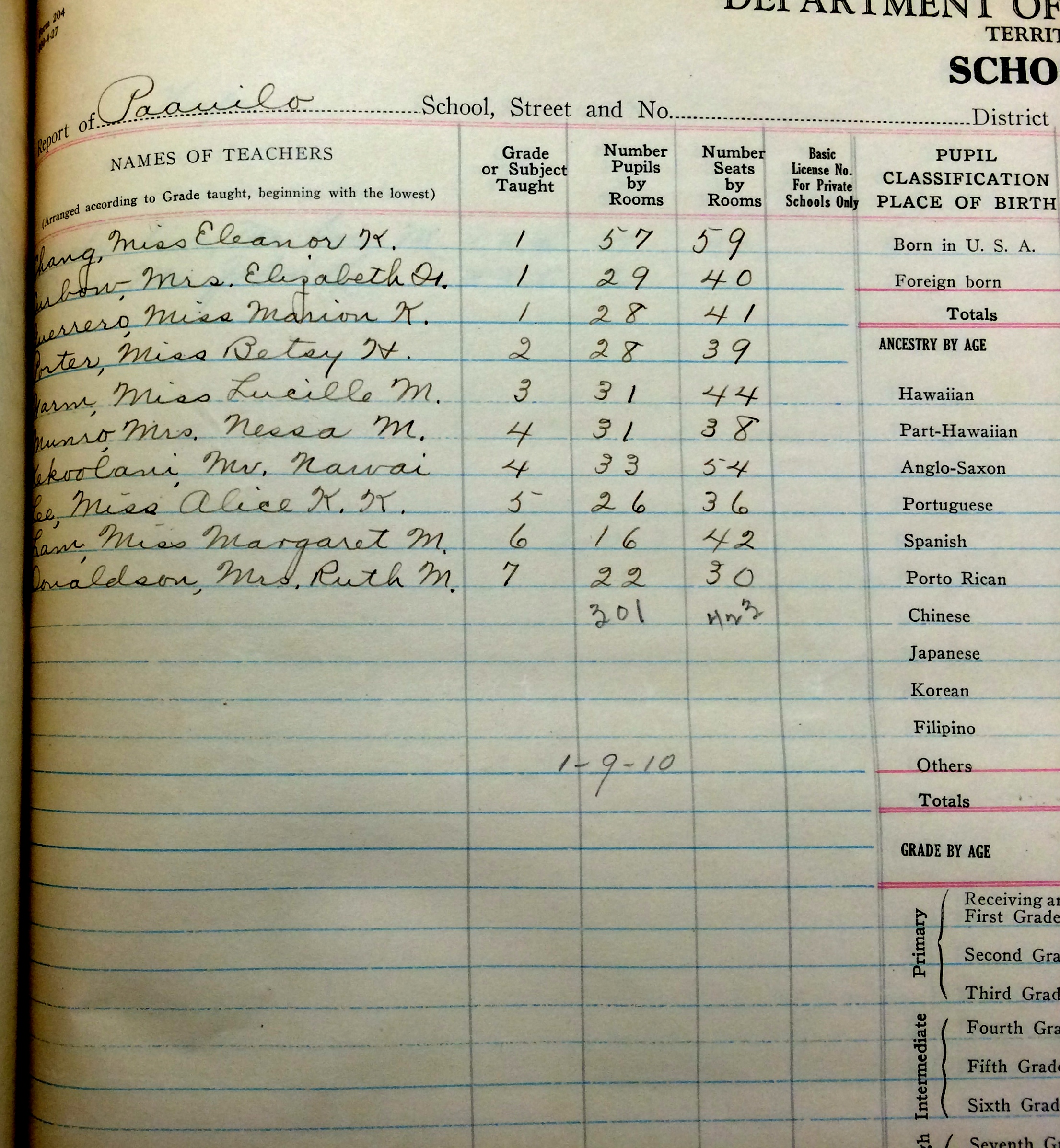 That is about as much as can be said about Margaret’s public life other than the fact that she graduated from McKinley High School, taught at the Pa‘aulio school in the Hāmākua district on Hawai‘i Island, matriculated at UH where she earned a BA in 1929 and an MA in 1932. After World War II she taught social studies at Farrington High School. She apparently never married or had children and died in 1999 at the age of 93 or 94.
