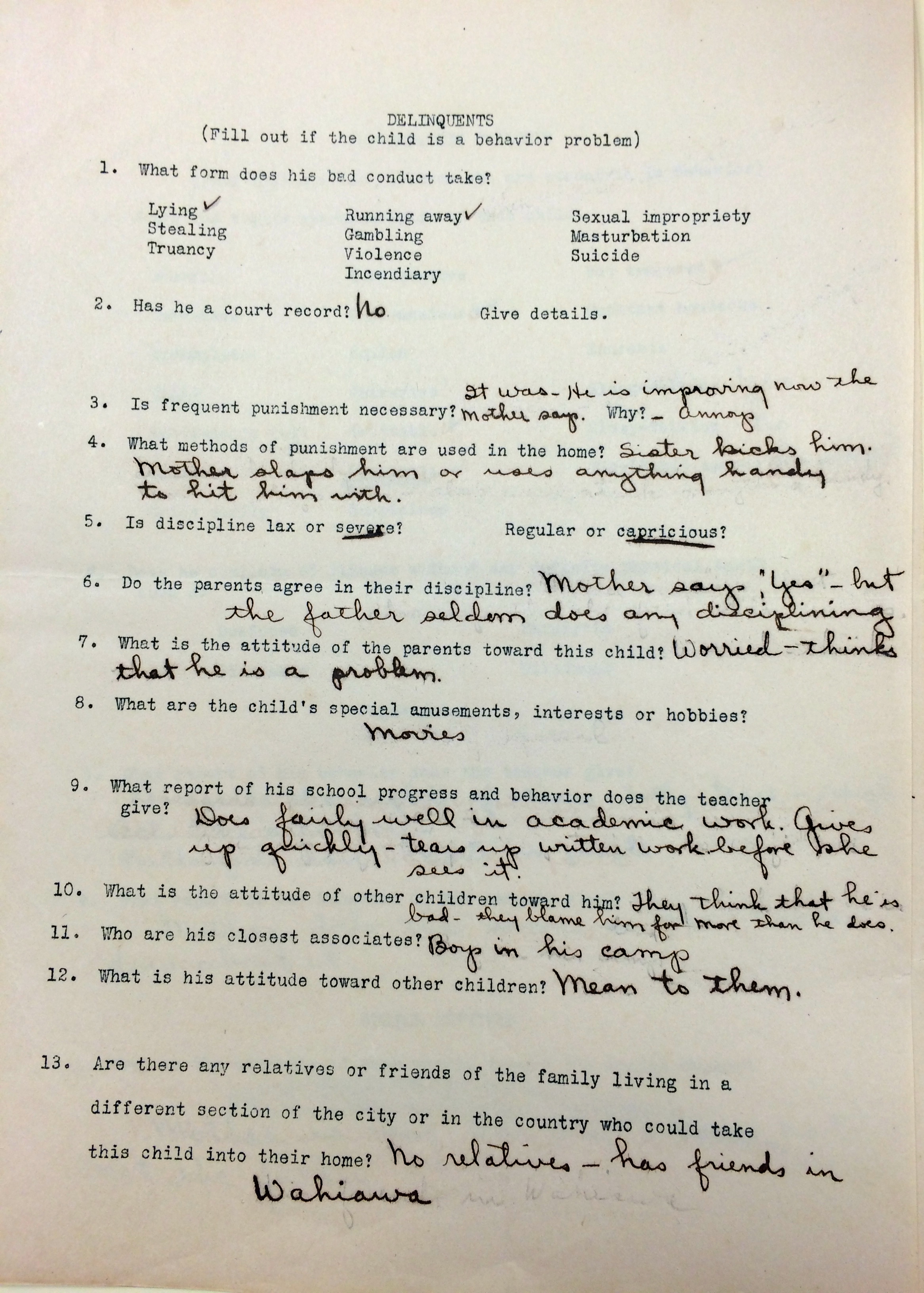 These papers lack the intimate ethnography typical of RASRL writers’ papers. Most sound official, follow a protocol, and include basic biographical details of their school-age subjects: their present living conditions, attitudes of the parents, a recounting of events that brought the children – and both girls and boys are represented here – to the attention of the “authorities,” and test scores. The child’s physical condition and brief medical history are provided; the child’s mental health and ability, as determined by the Stanford Achievement Test and reports from UH’s Psychological Clinic, are included. The writers report on the dynamics of the family, the student’s behavior in the classroom, and his level of diligence in school. Often the writer offers her opinion – most of the writers are female – on the student’s prospects for future adjustment and success.