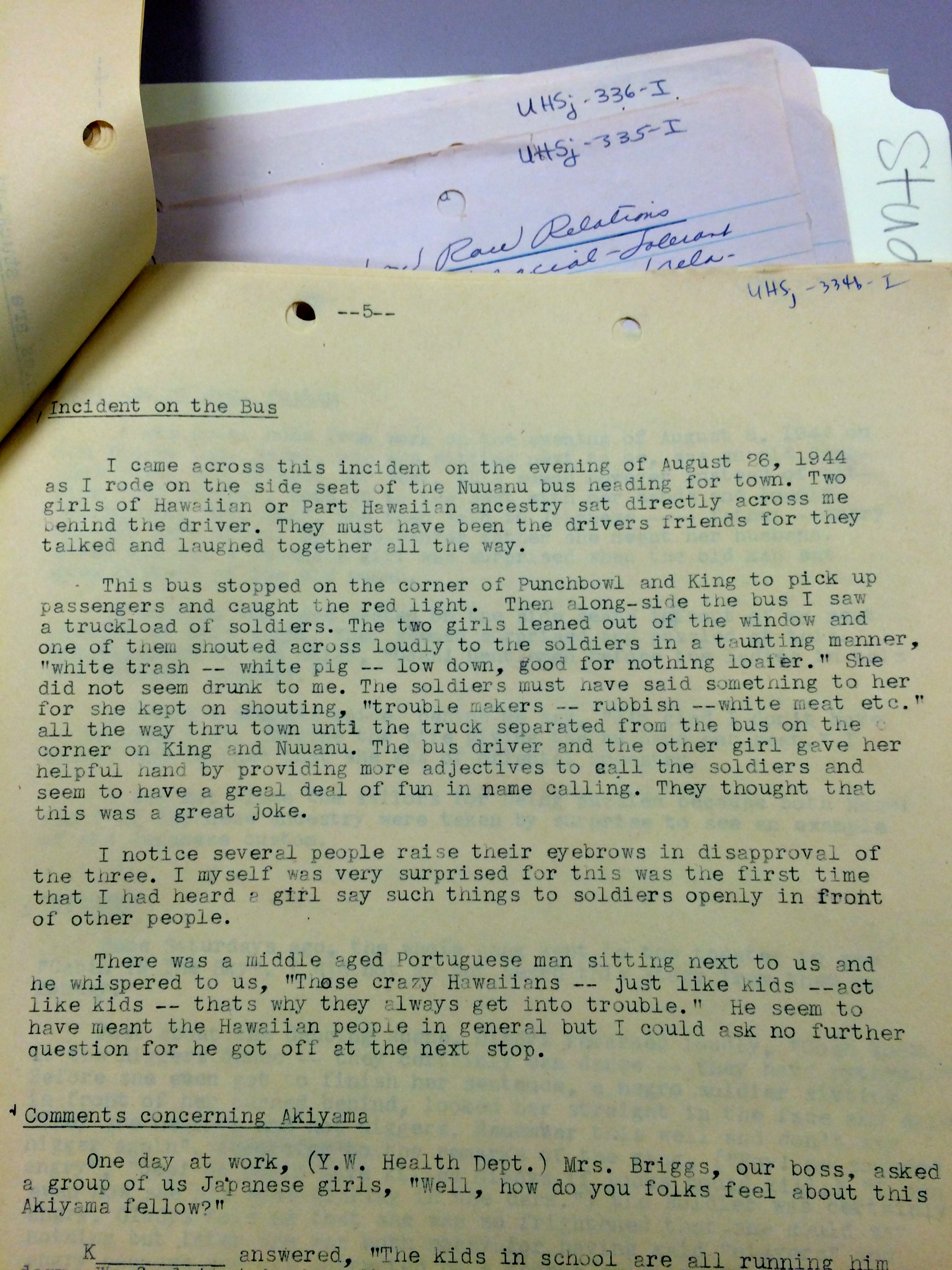 Morale writers also reported slights and humiliations that occurred on buses: Haole men refusing to yield seats to older Japanese women but immediately relinquishing their seats to Haole women; a Haole man being chided for giving his seat to an Issei (No. 325, “The Effect of War on Race Relations, undated, Folder 8: Student Journals 315-338). Another time, a writer’s friend offered his seat to an old Japanese woman who then held the seat and called out to her husband to take it. The soldiers watching said, “Gosh! Gentlemen before ladies in this God forsaken country.” The writer admitted that even she and her friend were surprised to see this woman’s deference to her husband (No. 334).