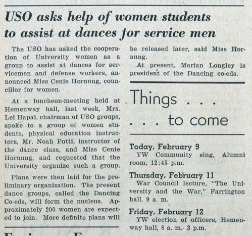 One of the persistent threads running throughout the RASRL writers’ papers before the War is the resistance Nisei women faced from their parents when it came to attending dances of any kind. The condemnation of dancing is only outmatched by their parents’ objection to interracial dating. Yet with the War and the arrival of troops – skewing the ratio of men to women from an estimated low of 100 or 150: 1 to a high of 350:1 – both dancing and eventually dating became activities that allowed local, and in particular, Japanese women to do their part in keeping up servicemen’s morale. In addition to attending dances sponsored by the AWS, other UH groups, and the Y, women students were recruited to attend USO dances. Hui Menehune, an organization sponsored by the USO, was created to make sure women attended dances. This group as well as the USO drew criticism, but one morale writer showed insight and offered a spirited defense:
