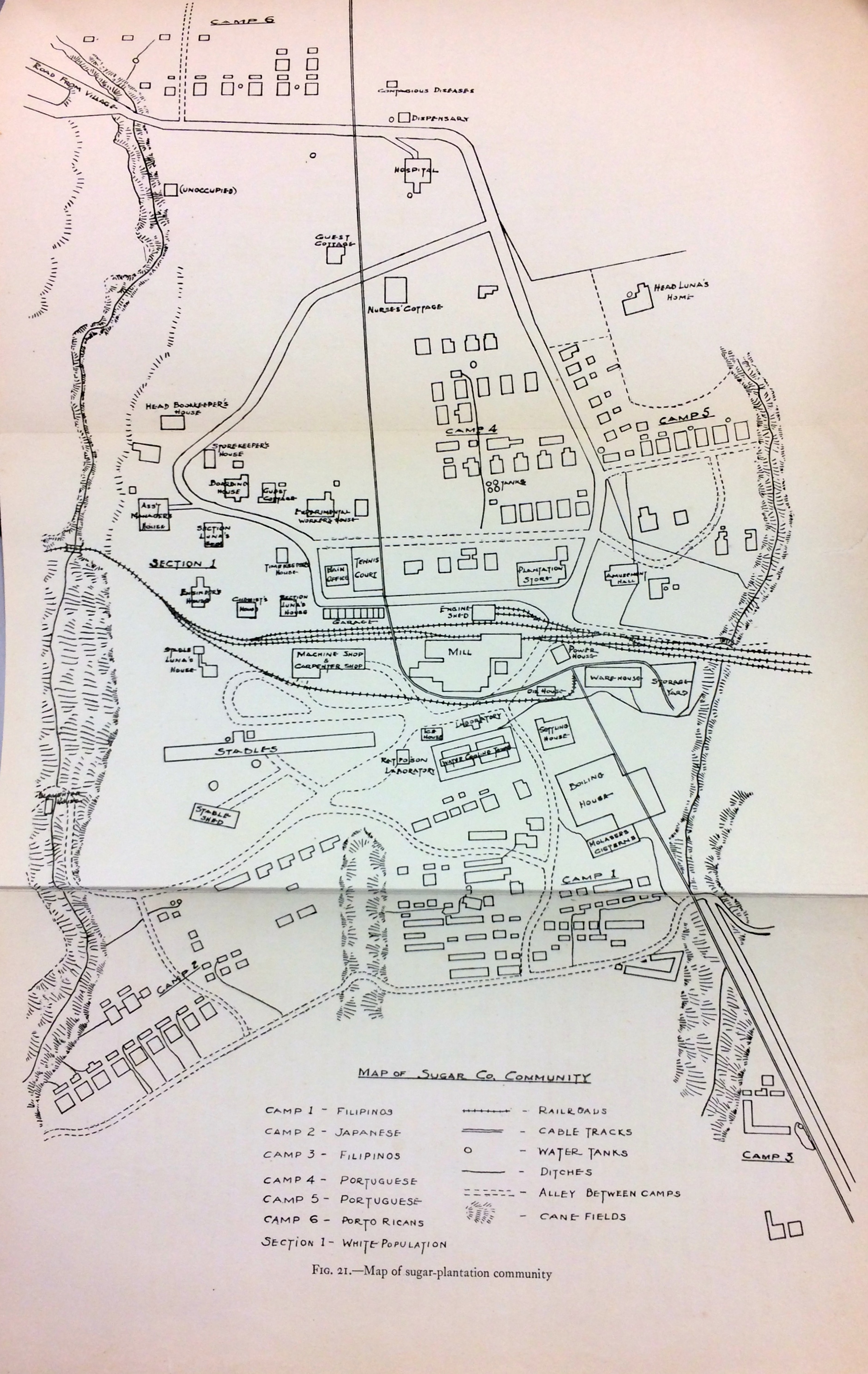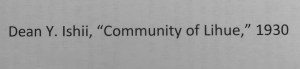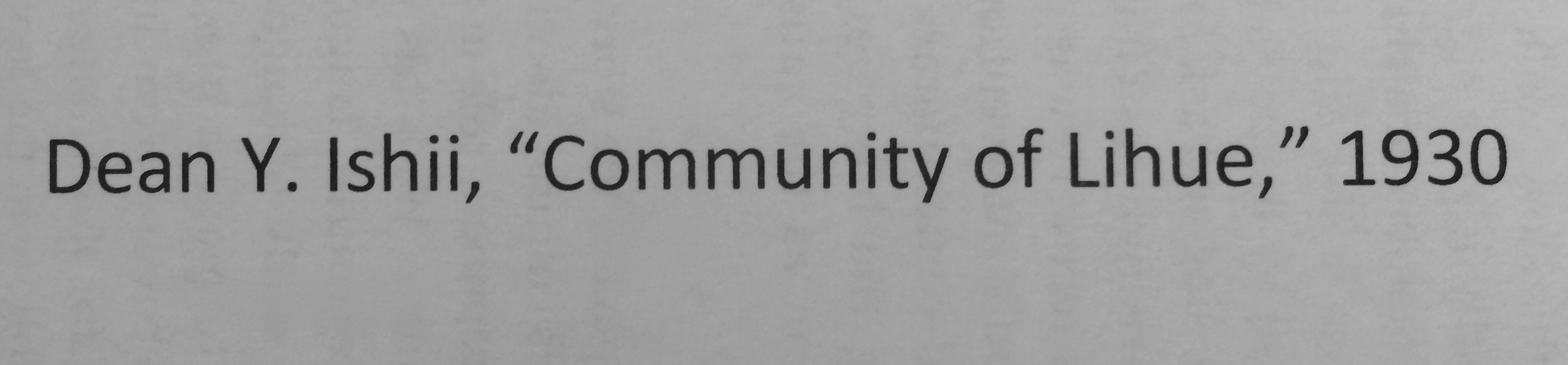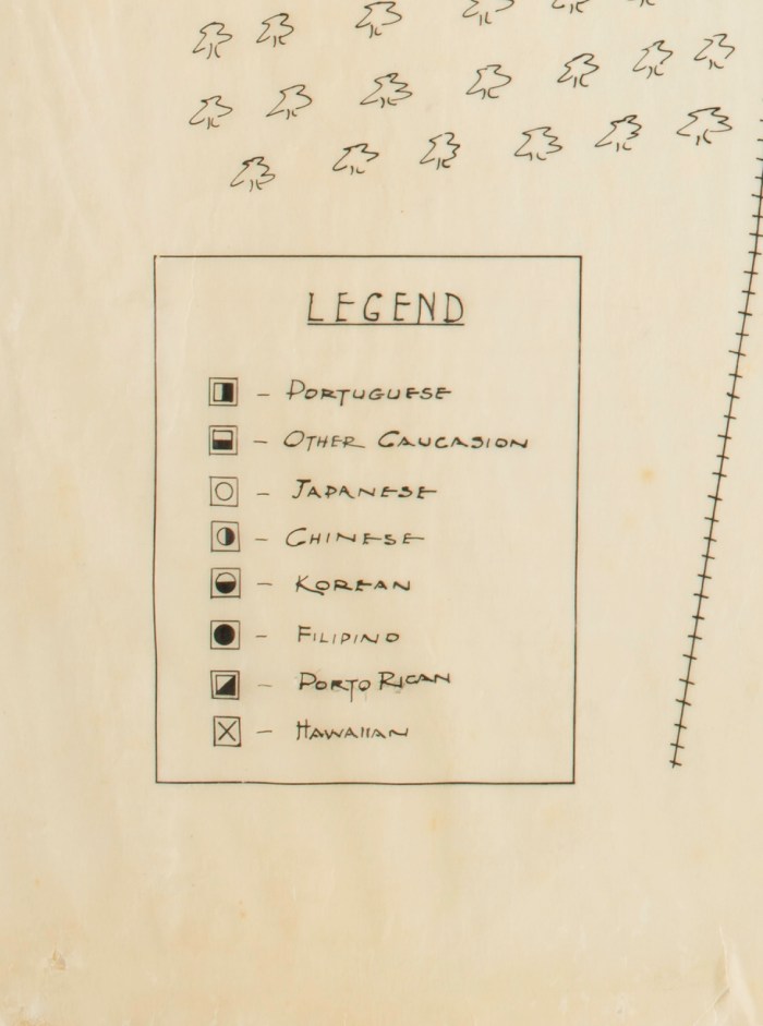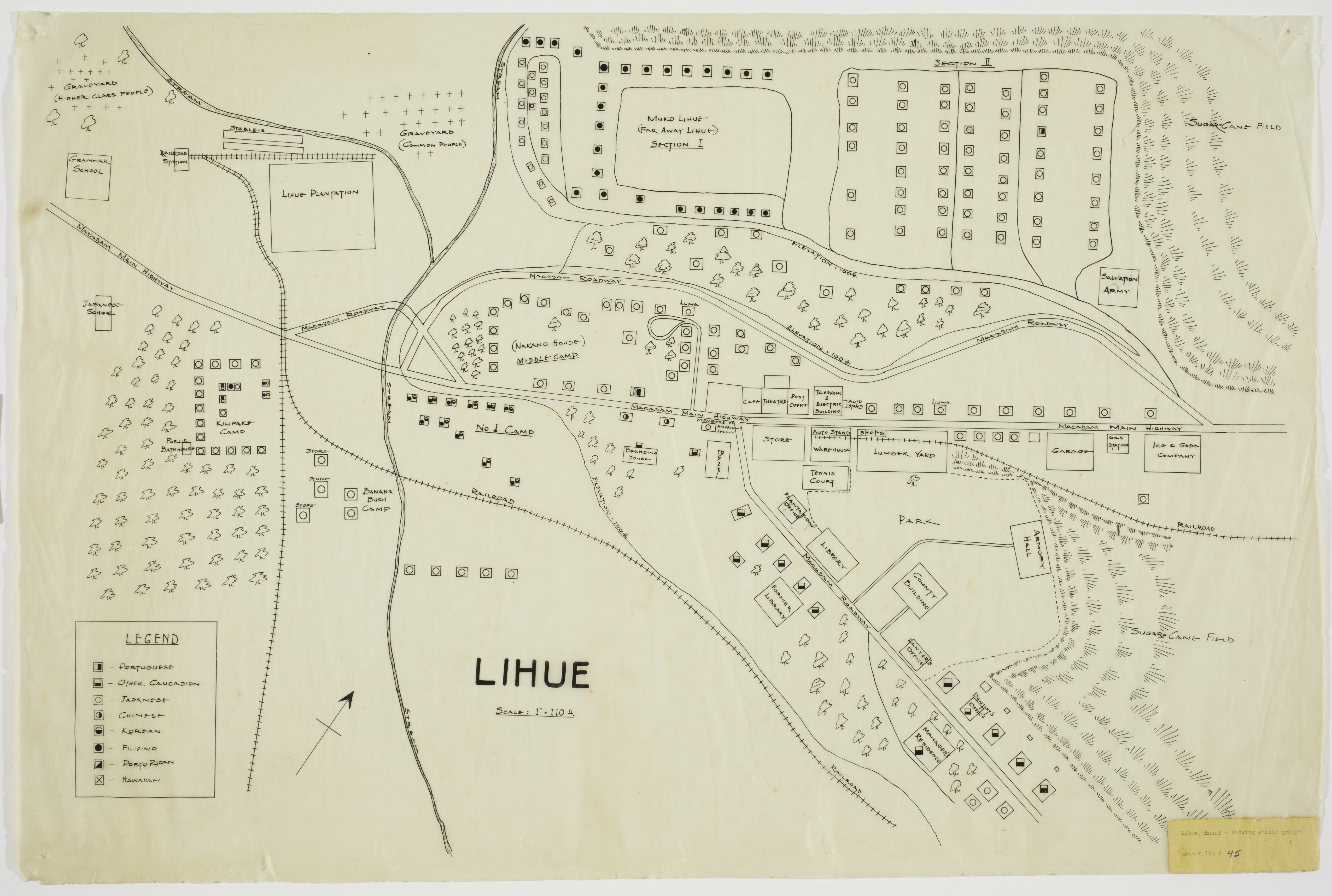 Sometime after the exhibit opened, I went back to Ishii’s paper to write a post to include in the online portion of the exhibit. Ishii seemed to describe the Līhu‘e map I had before me: the camp names – Kilipaki, Nakano, Banana were there, the locations of the schools and businesses were noted. But then on page three, I saw this: “The houses marked yellow are residence homes [sic] of the whites (haoles) [,] the rich of the community.” The Līhu‘e map, rendered in black and white, uses symbols not colors to denote ethnicity.