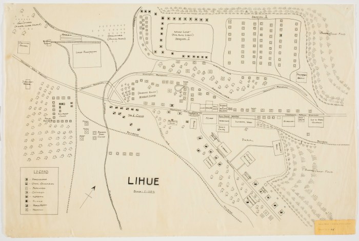 I consulted a list of RASRL community papers we had compiled from our research and found a paper about Līhu‘e that referenced a map written in the 1930s, a period that has an abundance of community studies. There was no map with the paper, but it’s not unusual to encounter a paper that refers to and describes a map that isn’t attached. An oversized one, like the Līhu‘e map, would be filed in a special map drawer – in this case, Drawer 2, #45. I skimmed (the operative word here) the paper, had a copy made and a caption prepared for the map.